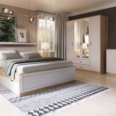Модель включает 6 самых востребованных модулей для гостиной комнаты: шкаф для одежды с возможностью добавления 2-х дополнительных полок, 2 шкафа многоцелевых с витринами для посуды, тумбу, полку навесную и стол журнальный.